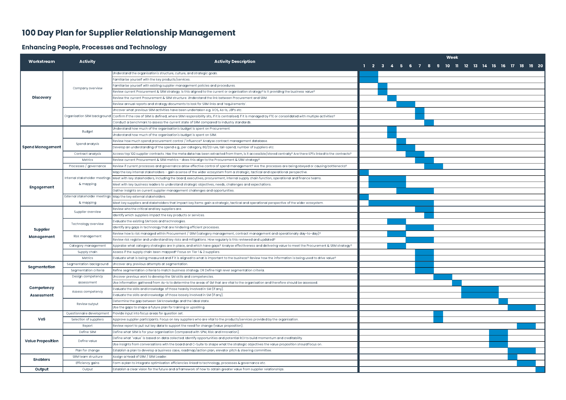 Assigning a Head of Supplier Management or Supplier Management Leader to lead strategic initiatives and formulating a plan to integrate optimisation efficiencies linked to technology, processes, and governance are enablers for success.