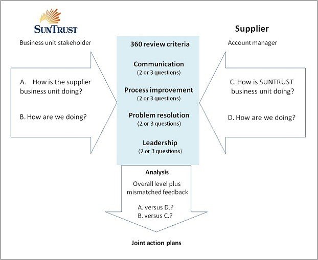 What might make our approach a little unusual is that we carry out a separate review for each SunTrust business unit that has an engagement with the supplier, and where appropriate the business units of the supplier. This enables us to quickly highlight inconsistencies that might be hidden in a more aggregated analysis. We look to tackle overall levels of performance, but in many cases it is the mismatch in feedback on the same subject that points to other problems that also need to be addressed. Carrying out these periodic reviews enables us to timely evaluate the effectiveness and impact of agreed-upon corrective actions.