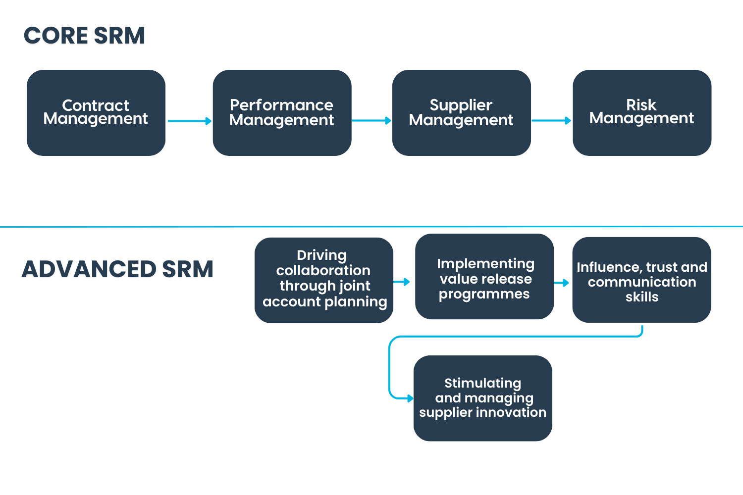 Modules 5 to 7 are more relevant to truly strategic (typically tier 1) suppliers, where the focus is on joint strategy development and creating new value. The behavioural aspects of SRM, specifically influence, trust and communication skills, are covered in Module 7 and as an embedded topic throughout the program.